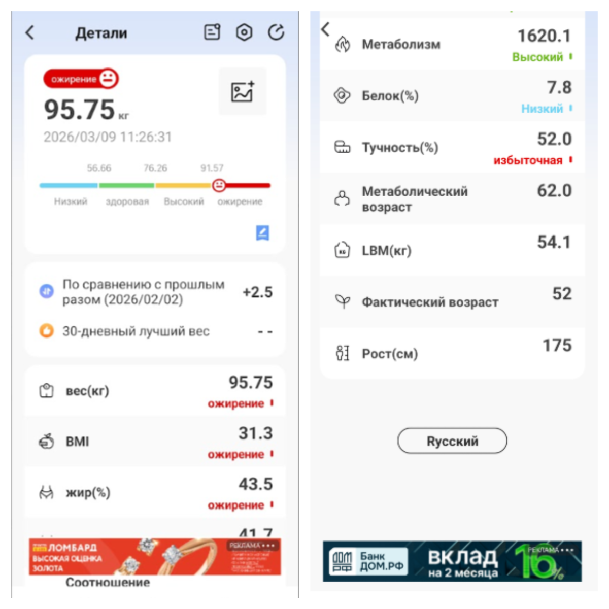 Увидела цифру 52, и решила, что речь идет о метаболическом возрасте. Тупо невнимательность. Еще, думаю, что чуточку изменилось отображение данных, обновилась программа. На этом месте был метаболический возраст. Я даже не вчиталась, по привычке подумав, что в данном случае 52 и есть метаболический возраст. О, как!