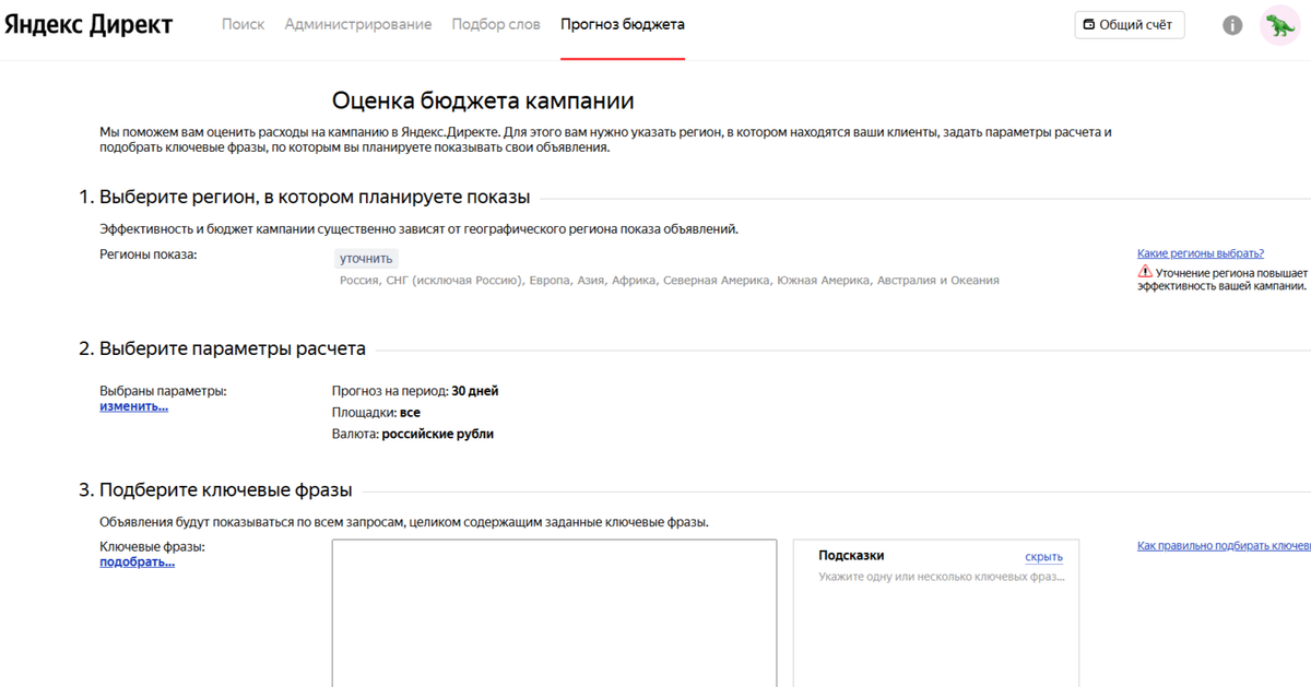 Для расчёта нужно указать несколько параметров. Во-первых, регион показа — можно выбрать один или несколько. Во-вторых, период расчёта — по умолчанию это 30 дней. В-третьих, ключевые фразы — их можно добавить из Wordstat или воспользоваться подсказками системы. И в-четвёртых, минус-фразы, чтобы отсеять мусорные запросы.