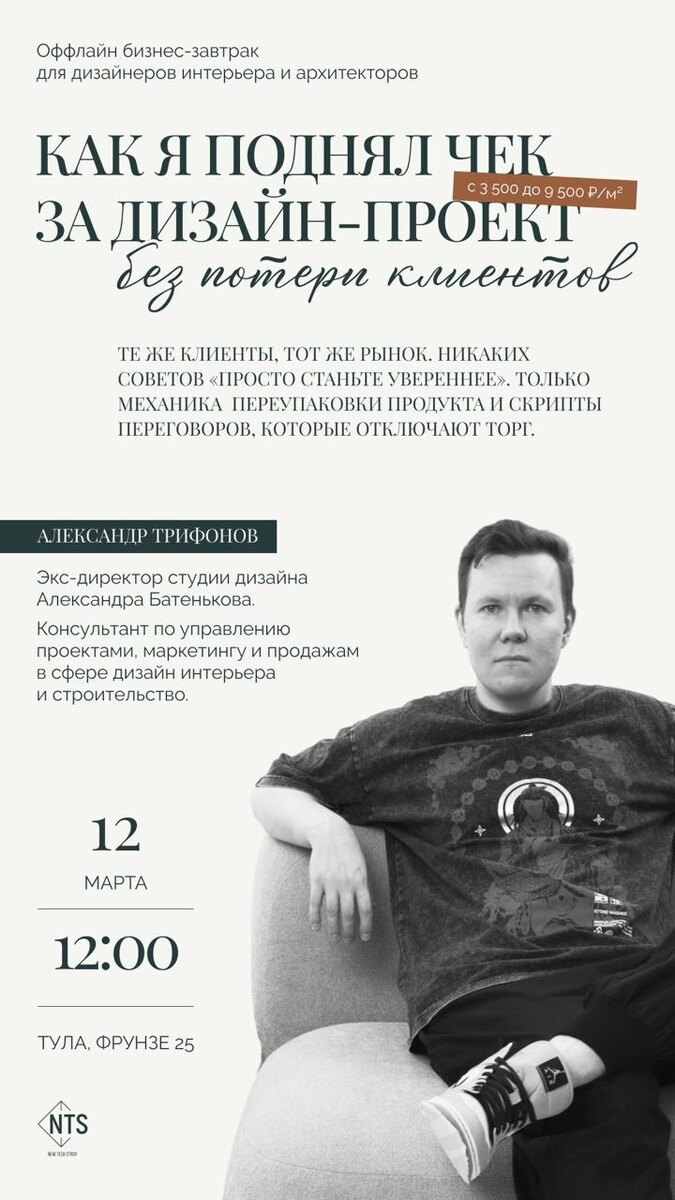 ! Буду у вас выступать послезавтра, 12 числа, в четверг, в 12:00 Тема: как поднять стоимость дизайн-проекта с 3500 до 9500: личный опыт. Разберу как за счет упаковки и навыков ведения переговоров любой дизайнер интерьера сможет поднять стоимость м2 своих услуг не меняя состав проекта вообще. С теми же клиентами. В том же рынке. Уйдете с пошаговым планом на внедрение. Услышите историю того, как это в свое время сделал я сам. Тула, Фрунзе 25, офис NTS group. Регистрация здесь: https://docs.google.com/forms/d/e/1FAIpQLSct1aq2SbdUGa7q9akdb7SfpG2puk4X766S9bjpw79ZY0J5vQ/viewform?usp=dialog