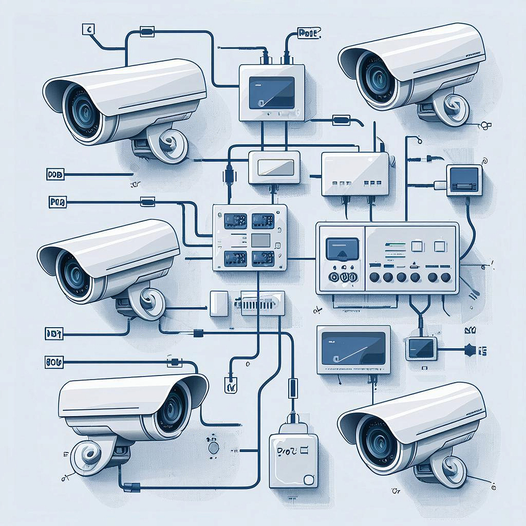 Типовые схемы: - Центральный шкаф с PoE‑коммутатором и NVR, камеры подключаются по звездообразной схеме. - Использование оптического канала для удалённых зданий: media‑converter/PoE‑инжектор у другой стороны. Защита: - Молниезащита/разрядники на внешних линиях. - Источник бесперебойного питания (ИБП) для регистратора и коммутатора. - Заземление металлических корпусов и щита.