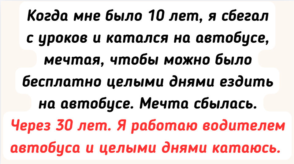 - Когда мне было 10 лет, я сбегал с уроков и катался на автобусе, мечтая, чтобы можно было бесплатно целыми днями ездить на автобусе. Мечта сбылась. Через 30 лет. Я работаю водителем автобуса и целыми днями катаюсь. И платят за это мне. © badabumka