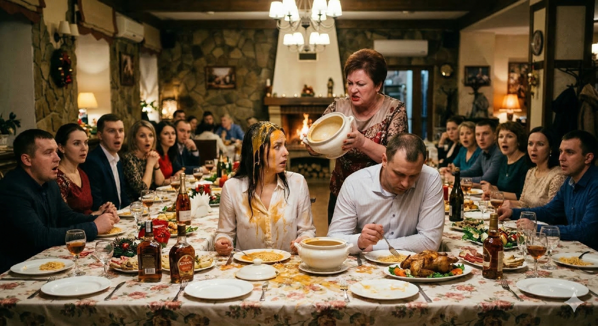 Жирный, оранжевый капкан домашней лапши сполз мне на ключицы, оставляя на белой блузке липкий след зажарки. Уши обожгло. Не столько температурой — суп успел чуть остыть, пока свекровь толкала тост, — сколько внезапным, звенящим звуком удара тарелки о скатерть.