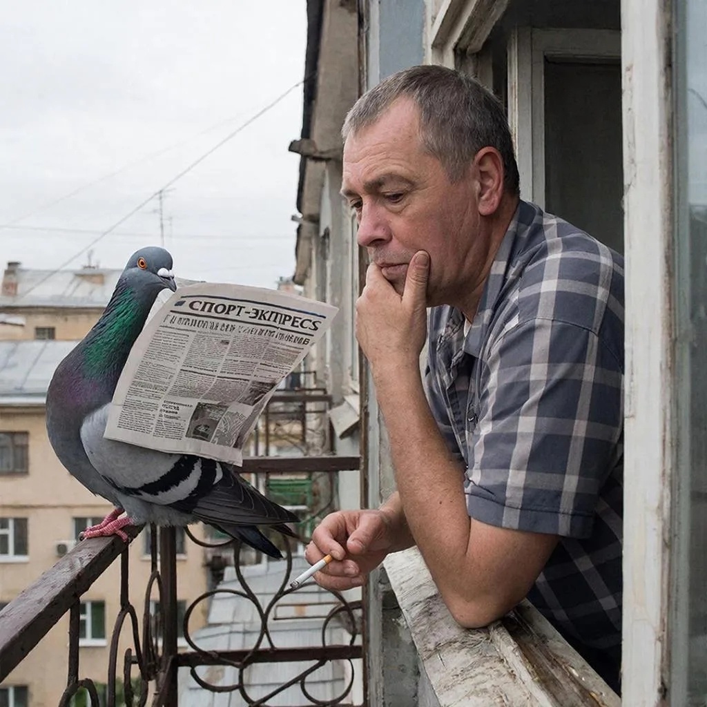 На соседнем балконе сидела обычная сизая птица с хвостиком коротким и важным видом — обыкновенный городской голубь. Ничего особенного вроде бы, если б не одно обстоятельство: этот самый голубь сидел чинно-пречинно, лапками упираясь в полочку и... читал свеженький номер «Спорт-экспресса».
