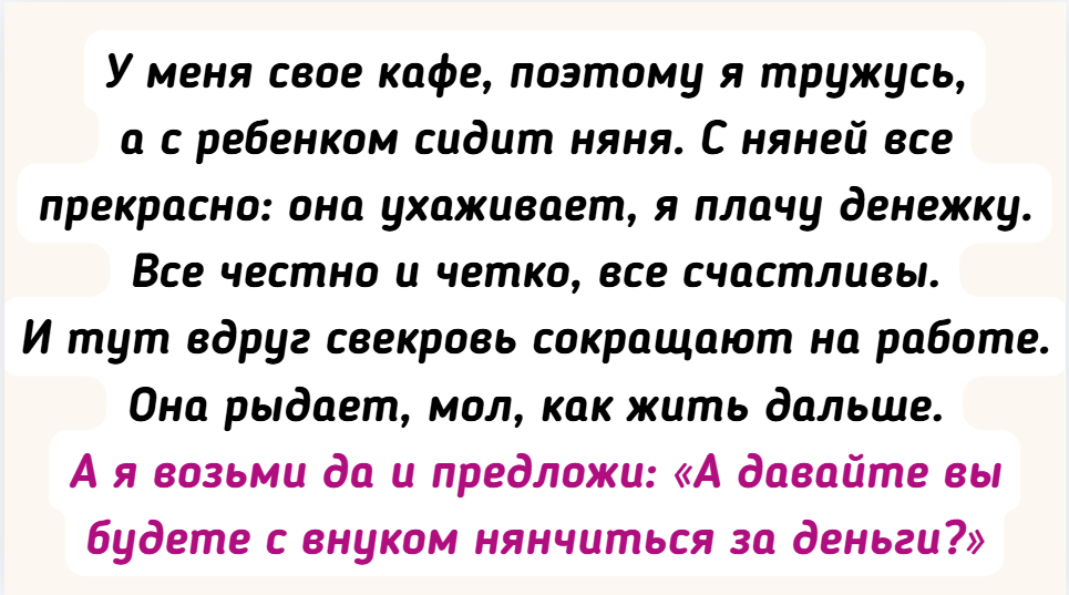 - У меня свое кафе, поэтому я тружусь, а с ребенком сидит няня. С няней все прекрасно: она ухаживает, я плачу денежку. Все честно и четко, все счастливы. И тут вдруг свекровь сокращают на работе. Она рыдает, мол, как жить дальше. А я возьми да и предложи: «А давайте вы будете с внуком нянчиться за деньги?» Обрадовалась свекровь: «Ой, как здорово!» А потом началось: «Ой, а я пораньше уйду!», «Ой, я так устаю!», «Ой, я покушать не успеваю мужу приготовить, ему кушать нечего! А ты могла бы заказать ему еду из своего кафе? У тебя же так вкусно!» И так каждый день!
