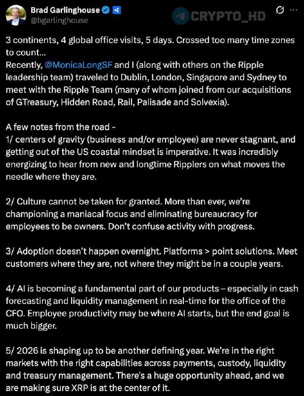 CEO Ripple Брэд Гарлингхаус вместе с командой топ-менеджеров объехал 4 офиса на 3 континентах за 5 дней – Дублин, Лондон, Сингапур и Сидней. Главные тезисы из поездки: ▪2026 год обещает быть переломным. Ripple усиливает позиции в платежах, хранения активов, ликвидности и управлении казначейством. Впереди огромные возможности, и делается все возможное, чтобы XRP был в центре этой стратегии. ▪Мир шире, чем побережье США. Центры деловой активности постоянно смещаются – необходимо мыслить глобально. ▪Культура – это работа. Ripple делает ставку на устранение бюрократии и воспитание в сотрудниках духа собственников. Активность ≠ результат. ▪Внедрение не происходит в одночасье. Платформы лучше, чем точечные решения. ▪AI входит в продукты Ripple. Прежде всего – в инструменты прогнозирования денежных потоков и управления ликвидностью в реальном времени для CFO-офисов. Crypto Headlines
