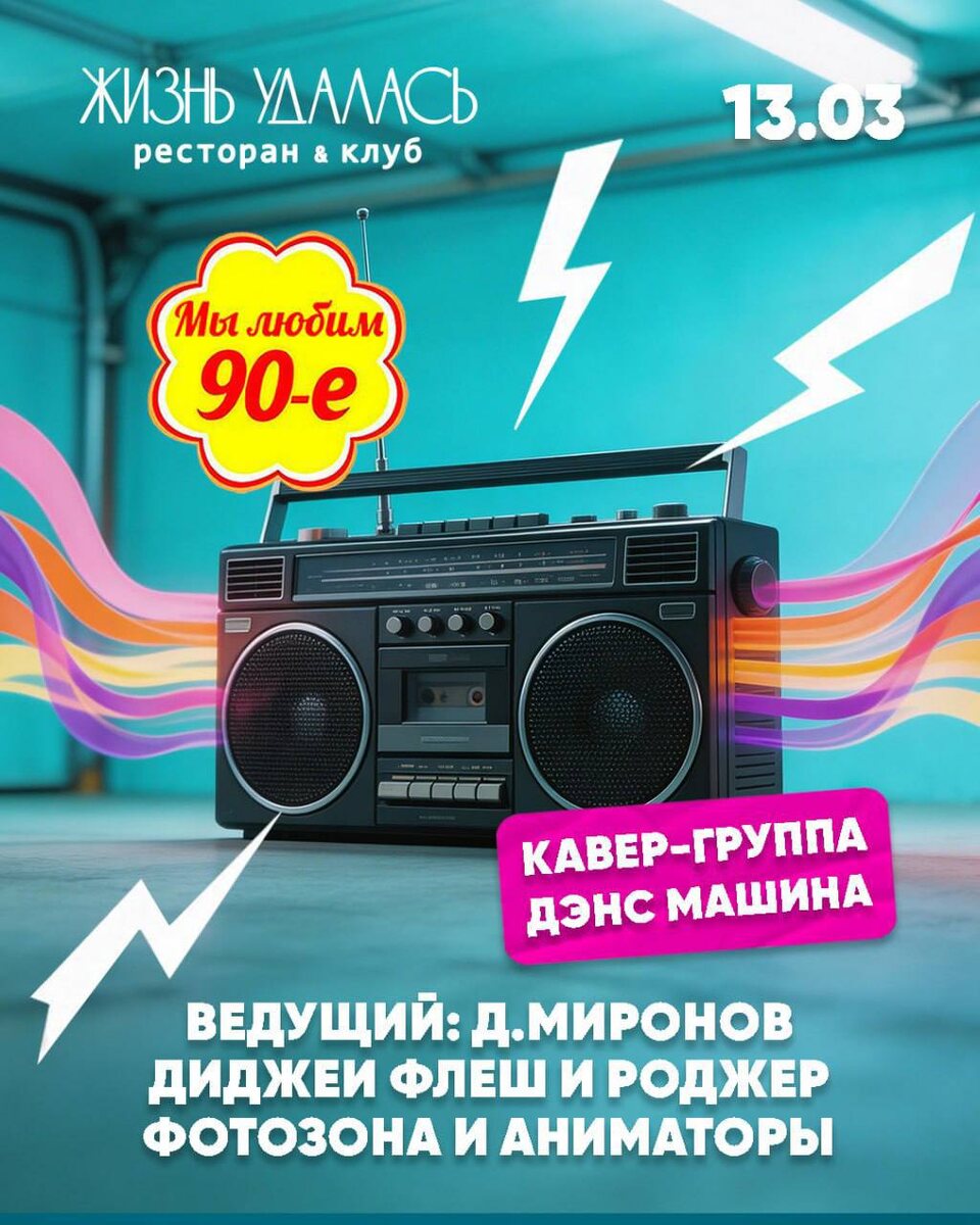 ! 🔥Костюмированная вечеринка 90-х Мы снова собираемся вспомнить лучшие моменты нашей юности! 🕺 Кто выступает: -Кавер-группа Дэнс Машина -Ведущий: Д.Миронов -Диджеи Флеш & Роджер -Подтанцовка 🪩Что вас ждёт: -Музей раритетов эпохи 90-х -Костюмированная фотозона для ярких кадров -Фотосессия! 💃Дресс-код: костюмы и аксессуары эпохи 90-х приветствуются! ВХОД: 👠 Для девушек бесплатный 👔 Для мужчин 500₽ 🕺Для компаний от 10 человек вход бесплатный при оформлении предварительного заказа. Онлайн бронирование столов: zhiznudalas.ru +7 (846) 211-55-67 ул. Лесная, д-23 к-49А