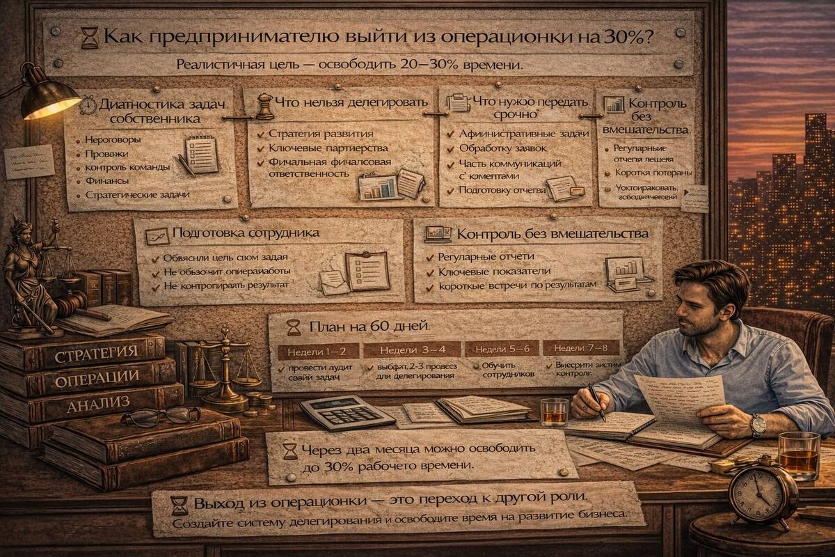 % Большинство предпринимателей хотят «выйти из операционки». Но резкий выход почти всегда заканчивается хаосом. Бизнес начинает тормозить, сотрудники теряются, а собственник возвращается ещё глубже в процессы. Реалистичная цель — освободить 20–30% времени. Этого уже достаточно, чтобы начать заниматься развитием, а не только текущими задачами. 🔎 Диагностика задач собственника Первый шаг — понять, чем вы реально заняты. В течение 5–7 дней фиксируйте все задачи: — переговоры — продажи — контроль команды — операционные вопросы — финансы — стратегические задачи Обычно выясняется, что значительная часть времени уходит на работу, которую может выполнять другой человек. 🚫 Что нельзя делегировать Есть зоны, которые в большинстве бизнесов остаются за собственником: — стратегия развития — ключевые партнёрства — финальная финансовая ответственность — формирование культуры компании Эти задачи напрямую влияют на направление бизнеса. Но важно, чтобы они не растворялись в операционной рути