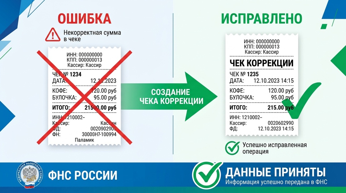 Знакомая ситуация: кассир ошибся суммой, отключили свет, забыли пробить чек курьеру, а потом хватились — уже поздно. Руки опускаются, потому что в голове сразу картинка: проверка налоговой и огромный штраф. Спокойно. Есть законный способ всё исправить. Называется чек коррекции. Рассказываю, как это работает в 2026 году, потому что из‑за нового НДС 22% тут есть важные нюансы. Представьте: вы вели учёт в тетрадке, ошиблись, заметили это и аккуратно исправили. Налоговая — это тот самый строгий проверяющий, который смотрит на ваши «тетрадки» онлайн. Чек коррекции — это ваше официальное заявление налоговой: «Я ошибся, вот правильные данные, примите их, пожалуйста». Главное: если вы исправили ошибку сами и до того, как её нашла налоговая, штрафа можно избежать. Ситуаций много, вот самые частые: ✅ Не пробили чек (забыли, не работал интернет, отключили свет)