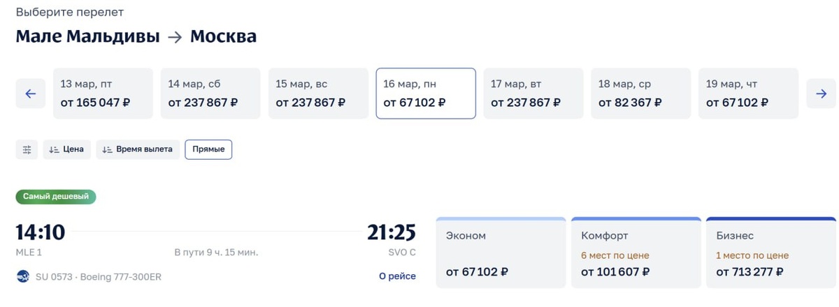 И все-таки цены на перелет с Мальдив прямыми рейсами «Аэрофлота» на некоторые даты рухнули