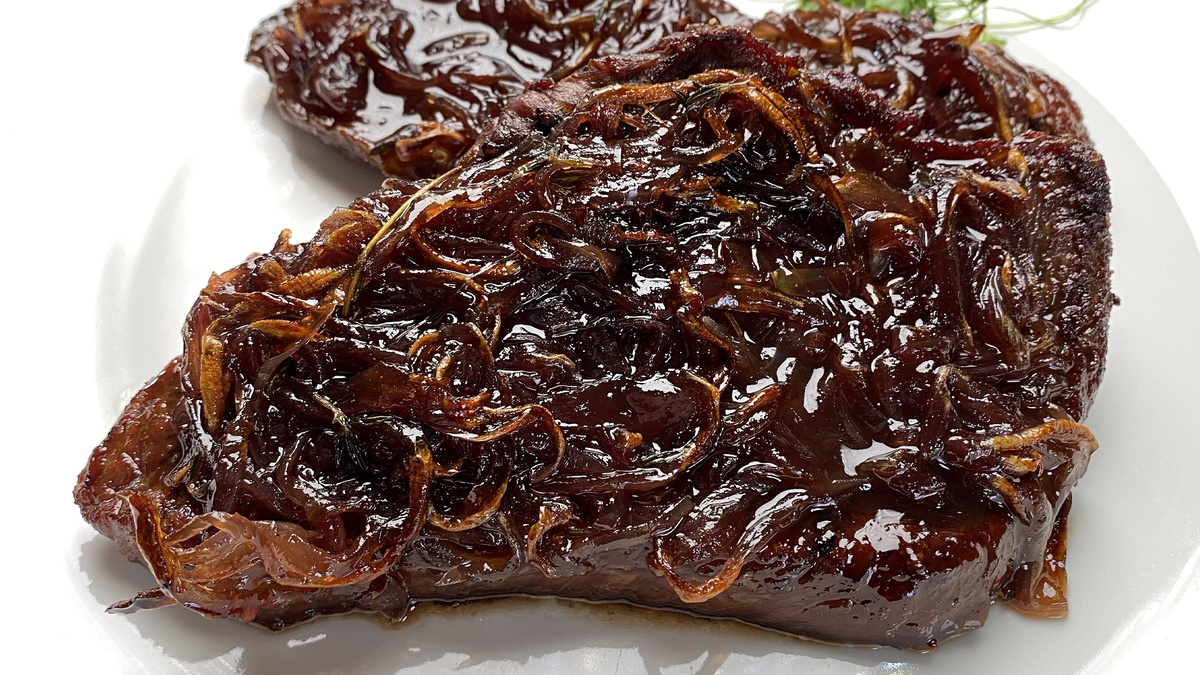 Подавай горячим — мясо сочное, лук сладко-карамельный, вино добавляет глубину вкуса. Очень вкусно!