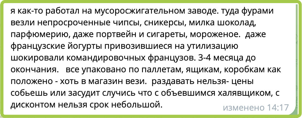 :) К слову, я слышал от владельцев крупной сети пекарен, что у них непроданное на грани срока годности уходит в утиль, хоть это и звучит странно. Никуда это не деть - в школы-сады- детские дома и т.п. НЕЛЬЗЯ, ибо есть шанс (мизерный) отравить кого-то и никто не рискует. Вот и утилизируют вкуснятину (которую сотрудники не разобрали). Русский ИТ бизнес + Мы в MAX