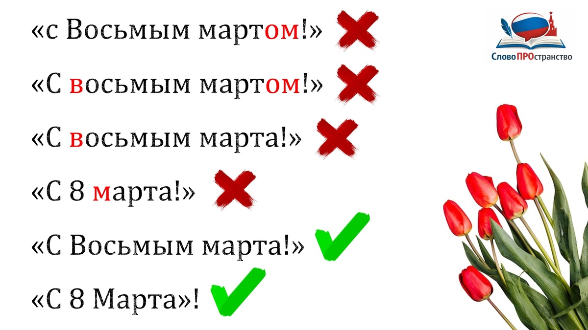 Дорогие подписчики! Команда «СловоПРОстранства» спешит поздравить вас с наступлением весны В последнее время мы ловим себя на мысли: а часто ли мы задумываемся, как правильно писать и склонять ту или иную дату? «Поздравляю с Восьмым мартом»? «С восьмым мартом»? А может, «С восьмым марта»? Давайте разбираться, чтобы не ударить в грязь лицом перед самыми грамотными девушками! На самом деле оба варианта могут быть правильными — всё зависит от контекста. Но есть четкие правила, которые стоит запомнить. Когда цифра стоит в начале, название месяца автоматически становится именем собственным (это же официальное название праздника!). Поэтому: Вариант «Восьмое марта» тоже абсолютно правильный. Но здесь хитрость в другом: Числительное пишем с большой буквы (потому что это начало названия праздника) Месяц — с маленькой Важный нюанс! Когда 8 марта — это просто календарный день, а не название праздника, пишем всё со строчных букв: 8 марта мы отмечаем Международный женский день (здесь «8 марта» — д