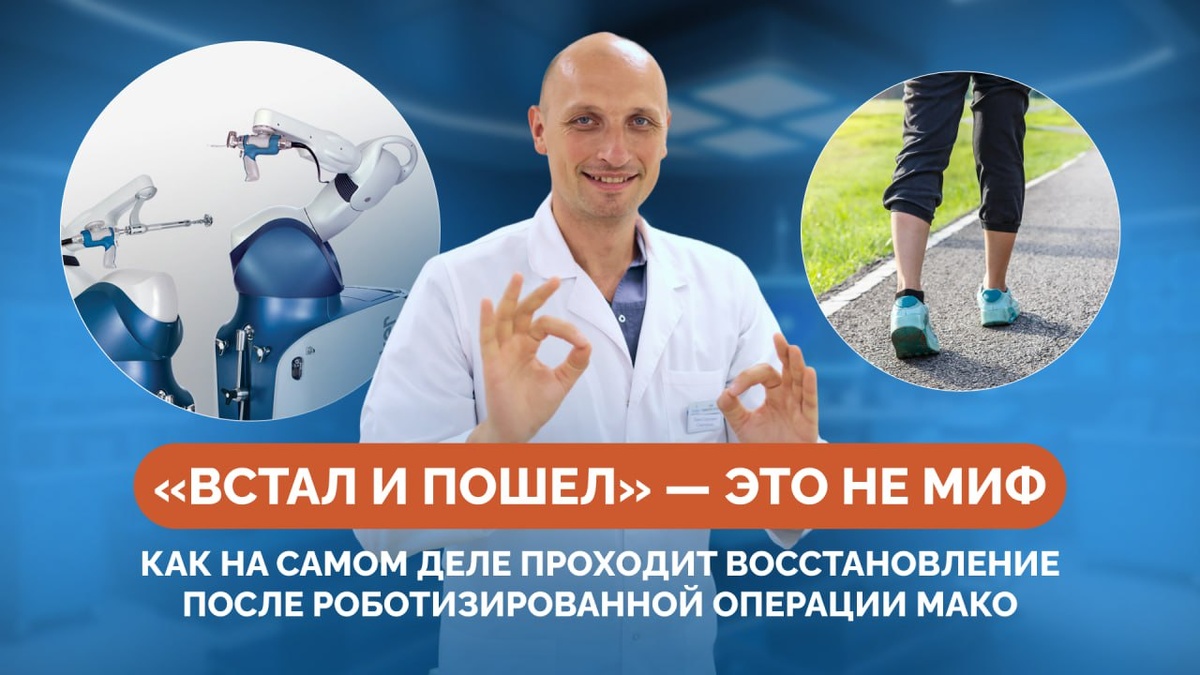 В сознании большинства людей фраза «эндопротезирование сустава» прочно связана с образом долгой и мучительной реабилитации: месяцы на костылях, постоянная боль, страх сделать лишнее движение и бесконечные ограничения. Этот образ настолько силен, что когда наши пациенты выкладывают видео, где они спокойно ходят по палате через несколько часов после операции, в комментариях тут же появляются обвинения в постановке. Но никакой постановки нет. Есть принципиально иной подход к восстановлению, который стал возможен благодаря роботизированной системе МАКО. Сегодня я, Павел Сергеевич Семиченков, врач-ортопед и хирург, подробно расскажу, как на самом деле выглядит реабилитация после современной операции, почему она начинается в день вмешательства и зачем нам нужны видео с пациентами.