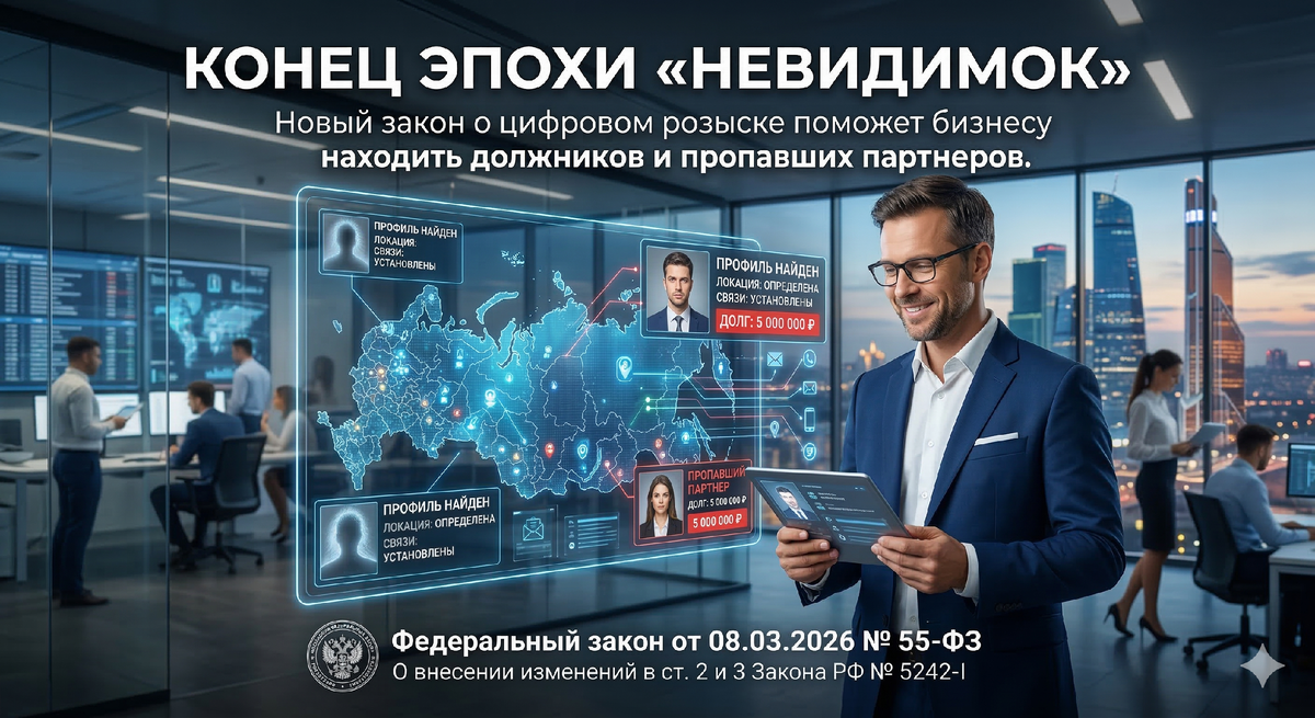 Президент России Владимир Владимирович Путин подписал Федеральный закон от 08.03.2026 № 55-ФЗ. Документ запускает легальный механизм запроса адресно-справочной информации о гражданах через базы МВД и портал «Госуслуги». Теперь любое физическое или юридическое лицо получило право официально искать нужного человека через государственный аппарат. Пока пресса обсуждает, как удобно будет искать дальних родственников, корпоративные юристы видят другое: государство создало мощнейший процессуальный инструмент для бизнеса. Как Архитектор права, я детально проанализировал этот механизм. Это не просто социальная функция. Это тектонический сдвиг в системе доказывания недобросовестности оппонента в суде. Аналитика: как закон ломает старые судебные схемы уклонистов В сложном арбитраже (взыскание долгов, банкротство, корпоративные конфликты) главная проблема — это ответчик или партнер, который физически исчезает, не получает почту по месту регистрации и обрывает контакты. Раньше суды часто буксовали