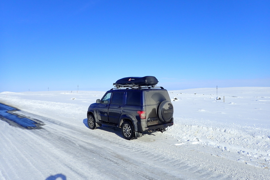 Закрывают дорогу не просто так, а ради безопасности нерадивых путешественников, ведь от поворота на посёлок Туманный начинается бескрайняя снежная тундра, ледяная пустыня, уходящая за горизонт, изредка разбавленная невысокими белыми сопками. И вот в такой «снежной степи», в плохих погодных условиях, дорогу заметает за считанные минуты и найти направление в таких условиях становится просто невозможно! С погодой нам повезло, небо было чистое и светило согревающее весеннее солнце, и мы отправились на встречу с Баренцевым морем.