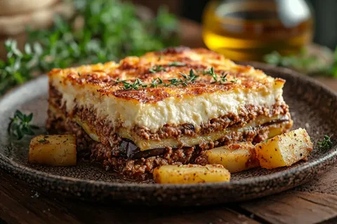Классическая мусака — это традиционное греческое блюдо, которое представляет собой многослойную запеканку из баклажанов, мясного фарша с томатами и соуса бешамель. Это сытное и ароматное блюдо, которое подается как основное. Итак: рецепт классической греческой мусаки. Ингредиенты (Форма 30х20 см) Для овощного слоя: · Баклажаны — 3–4 крупных (около 1–1.2 кг) · Картофель — 4–5 средних клубней (по желанию, для более сытного варианта, но в классике часто только баклажаны) · Соль — для посыпки баклажанов · Оливковое масло — для жарки Для мясного соуса (кимас): · Фарш (баранина пополам с говядиной или только говядина) — 800–900 г · Лук репчатый — 2 крупные луковицы · Чеснок — 3–4 зубчика · Помидоры в собственном соку (или свежие, протертые) — 600–700 г (или томатная паста 2 ст.л. + вода/бульон) · Красное сухое вино — 150 мл · Оливковое масло — для жарки · Корица — 1 палочка или 0.5 ч.л. молотой · Сахар — 1 ч.л. (погасить кислоту томатов) · Соль, перец — по вкусу · Петрушка (зелень) — не