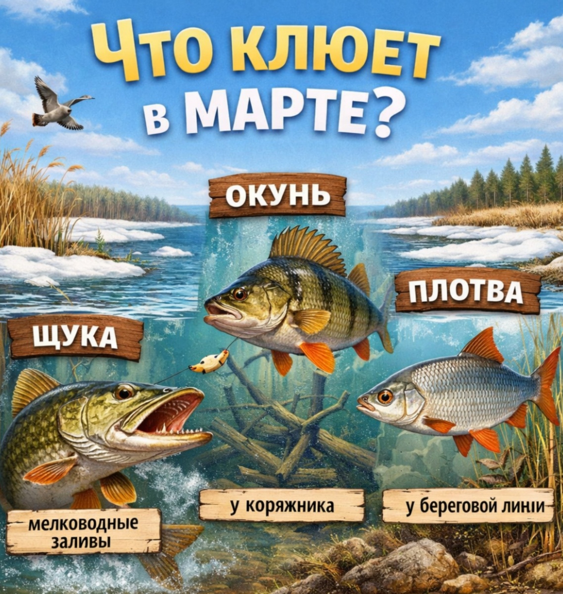 ». Лёд тает, вода начинает насыщаться кислородом, и многие виды становятся активнее перед нерестом. Ниже — где и как искать основные виды рыбы в марте. 🎣 🐟 Щука Активность: очень высокая — преднерестовый жор. Где искать: мелководные заливы, прогреваемые солнцем у кромки льда или на границе открытой воды у камыша и прошлогодней травы у впадающих ручьёв и речек Глубина: 0.5–2 м. Особенности: щука выходит на мелководье перед нерестом лучше клюёт в солнечные дни часто ловится в обеденное время Приманки: небольшие воблеры колебалки силикон 🐟 Окунь Активность: стабильная, часто собирается в стаи. Где искать: у бровок возле мелководья у коряжника возле остатков водной растительности в устьях притоков Глубина: 1–3 м. Особенности: стая постоянно перемещается если нашли — можно быстро наловить много Приманки: мормышка с мотылём маленькие балансиры микроджиг 🐟 Плотва Активность: начинает активно кормиться перед нерестом. Где искать: у береговой линии в местах притока свежей воды возле