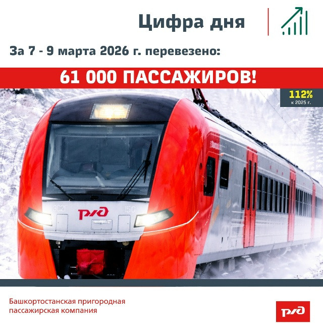 В период праздничных дней пс 7 по 9 марта на полигоне обслуживания Башкортостанской пригородной пассажирской компании электричками воспользовались 61 тысяча пассажиров, что на 12% выше аналогичного периода прошлого года, сообщает БППК. В преддверии выходных была проведена масштабная работа по увеличению составности ряда пригородных поездов. Так, пригородные поезда №7426 Приютово – Уфа, № 7427 Шакша – Приютово, №7428 Приютово – Тавтиманово обслуживал электропоезд ЭС2Г «Ласточка» в 12-ти вагонном исполнении вместо стандартных 6-ти вагонов. 7 марта составность пригородного поезда №7404 Приютово – Тавтиманово увеличена с 4 до 6-ти вагоном. Кроме того, в дни с 7 по 10 марта скорые пригородные поезда «Южного экспресса» сообщением Уфа – Кумертау – Оренбург №7439/7440/7442/7441 и Оренбург – Кумертау – Уфа №7452/7451/7453/7454 обслуживал электропоезд серии ЭС-104 «Финист» в 5-ти вагонном исполнении. Ранее сообщалось, что в предстоящие праздничные дни в Башкирии увеличат составность электричек.