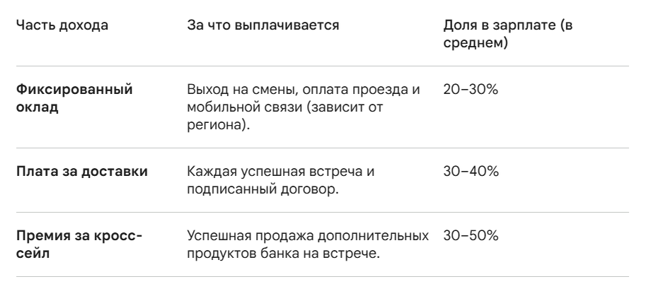 «До этого работал в доставке еды. Тут уровень совсем другой — ты лицо банка. В приложении все четко: куда ехать, что сказать. Штрафов как таковых нет, но за качеством следят жестко (тайные покупатели, прослушка звонков). Если работать по скрипту, план выполняется легко. В Москве спокойно можно делать 100-120 тысяч, если не лениться брать доп. смены».