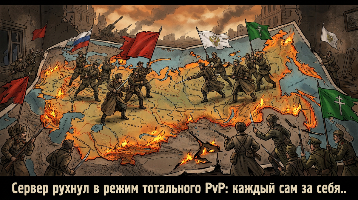 Холодная реальность такова: когда в стране нет легитимной власти, а все политические механизмы сломаны, спор о будущем решается исключительно с помощью пулеметов. Гражданская война в России — это масштабная королевская битва, где бывшая империя превратилась в огромную PvP-арену. Миллионы людей убивали друг друга за то, чей образ будущего будет загружен на сервер.
