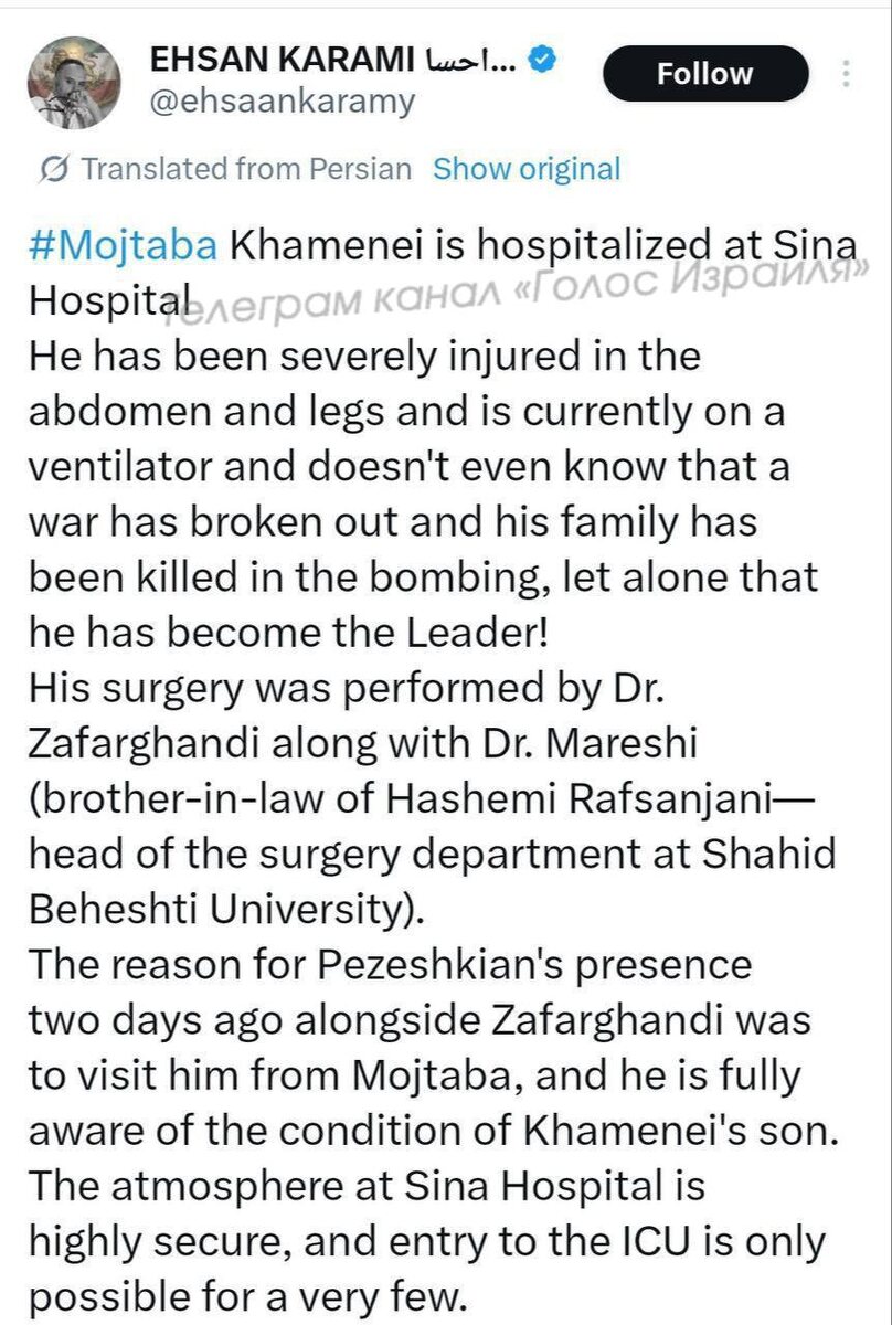 ⚡️Бывший ведущий иранского госТВ Хасан Карами: новоиспечённый аятолла Моджтаба Хаменеи госпитализирован в больнице «Сина» и подключён к