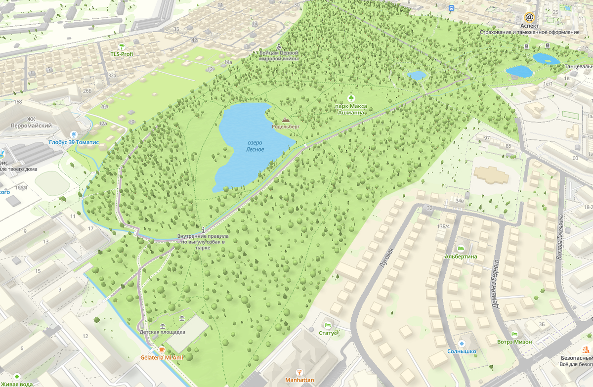 Всем привет, сегодня покажу неплохое место для рыбалки и отдыха в черте города. Расскажу об озере Лесном в Ленинградском районе Калининграда. Предыдущие статьи из рубрики "Места для рыбалки": Озеро расположено в центре парка Макса Ашманна, кстати власти недавно взялись за парк и начали облагораживать, пока правда только освещение и несколько лавочек, но ждем большего. Мне парк нравится, такой дикий, как будто действительно в лесу гуляешь. Но к сожалению, пока выглядит полузаброшенным, хотя посещаемость большая. 3-4 рыбака всегда найдется и семьи пикники устраивают. Посмотрите на карту, самые лучшие места для рыбалки на хищную рыбу с искусственной приманкой вроде блесны или воблеров в правом верхнем углу озера прям под сопкой. Я обошел все озеро и только там хорошая глубина, хотя в целом озеро не из глубоких конечно. Я пришел увидеть окуня или щуку в идеальном раскладе, но поздновато пришел и рановато ушел, местные рыбаки говорят лучше быть тут уже в 5 утра. Брал с собой набор блесен