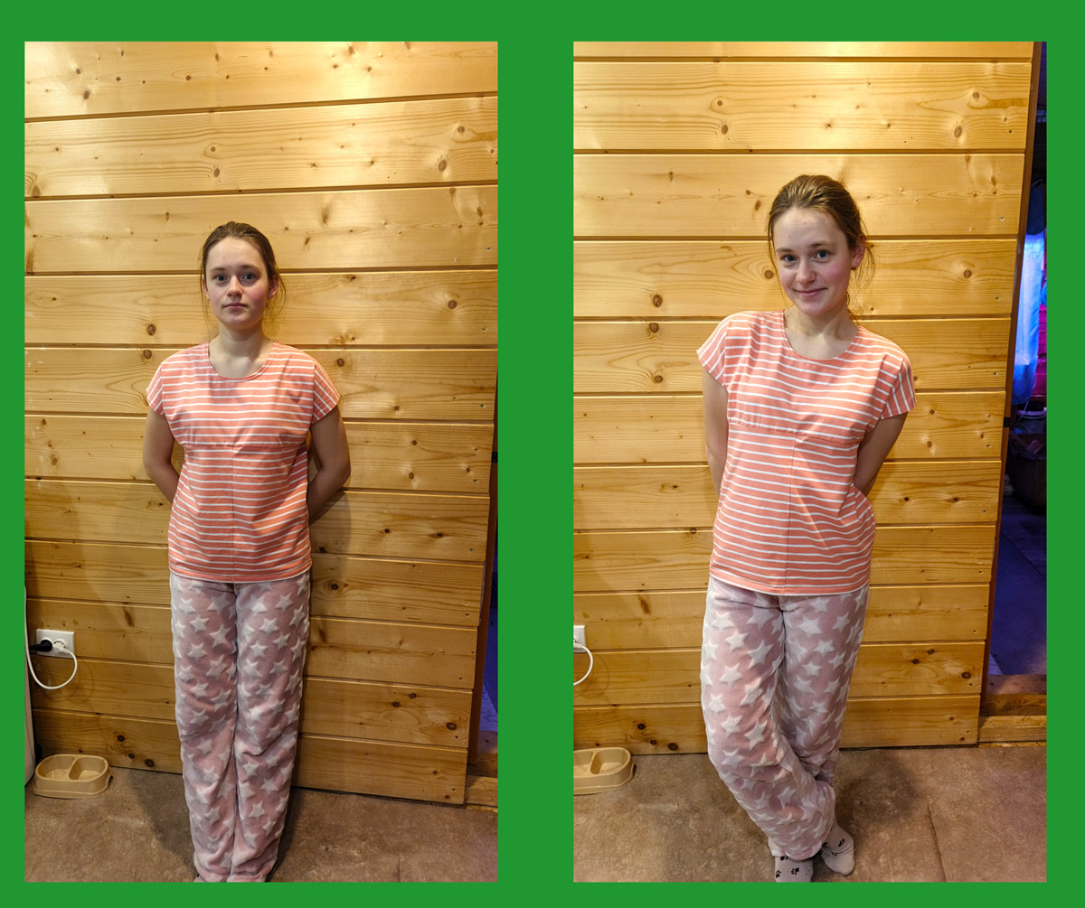 Анюткин, заказ выполнила. Розовые футболочки готовы. Несмотря на коварные проделки оверлока, я таки сшила четыре футболки. Заказчица поставила два условия: цвет розовый, футболки разного кроя. Получилось всё отлично, заказчица довольна. На пошив ушло два метра ткани — из одного метра 2 футболки. Полосатая ткань — кулирка с лайкрой. Светло-розовая кулирка 100% х/б. Ткань покупала на ВБ. Качество отличное, цена за оба отреза 950 рублей.