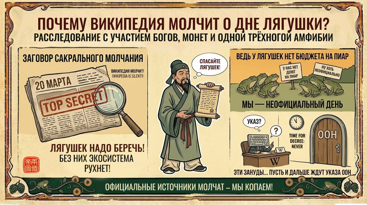 Сегодня, 20 марта, — Всемирный день лягушки. По крайней мере так пишут на множестве площадок… Но Википедия молчит. Совпадение? Не думаю. Пока мы празднуем, мировое закулисье пытается скрыть от нас правду. Ведь у лягушек нет бюджета на пиар, поэтому будем считать этот день неофициальным. И наш пост в поддержку общественной организации «Спасите лягушек!», а эти зануды из Википедии пусть и дальше ждут указа ООН. И пока официальные источники играют в молчанку, мы копнем вглубь веков и обратимся к образу трехлапой жабы Чань Чу (招財蟾蜍, жаба, привлекающая богатство). Вот тут и выясняется, что настоящая сила лягушек не в экологии, а в магии денег. Вы думали, Чань Чу — это просто милая жаба с монеткой во рту? Как бы не так. Как гласят официальные хроники, изначально это был злой дух, наводящий порчу. Жаба была запредельно жадной и вредной — воровала сокровища, изводила соседей или гадила в колодцы. Так продолжалось до тех пор, пока не вмешался вечно смеющийся бессмертный даос Лю Хай (赤腳大仙). Прои