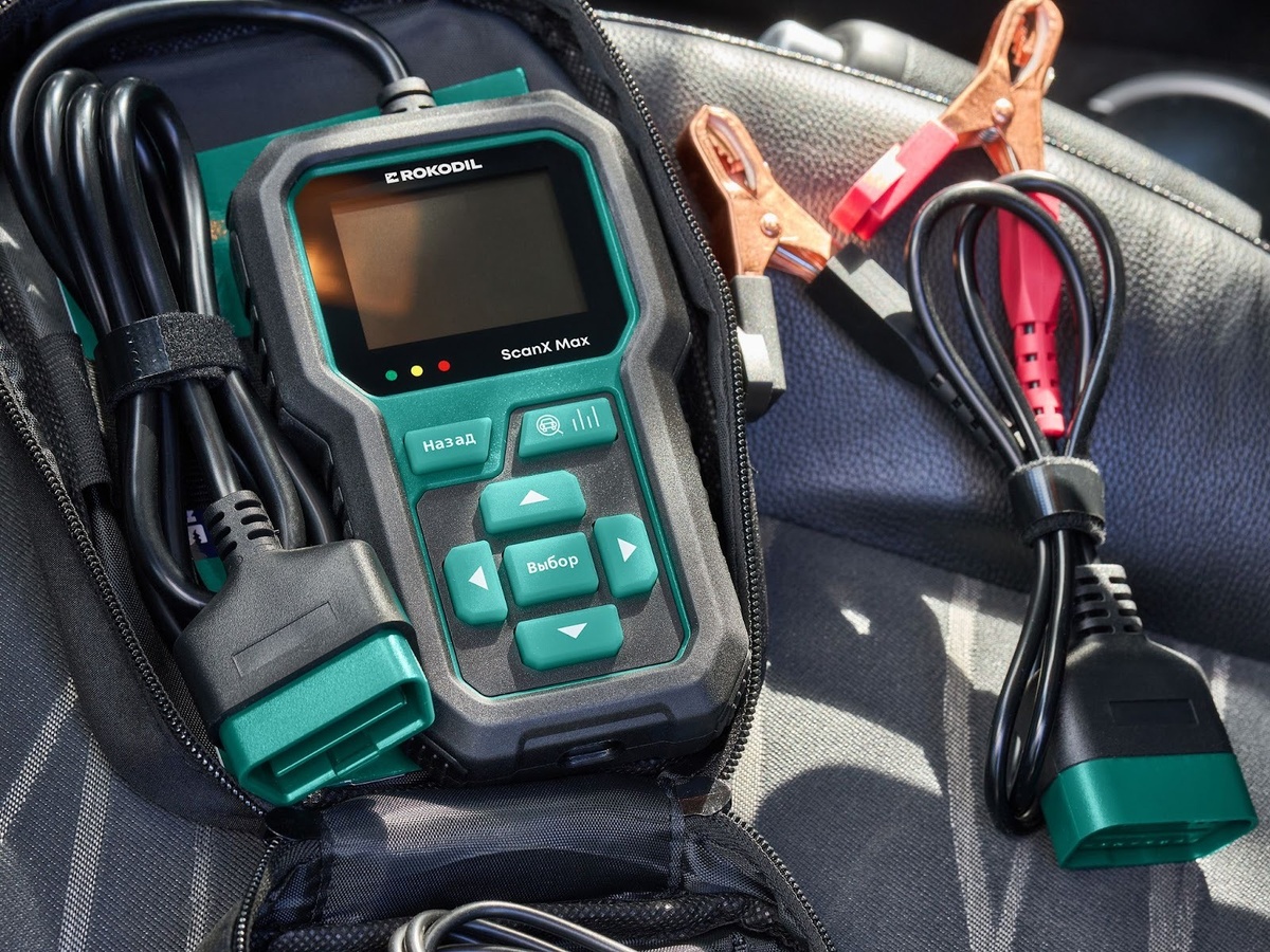 На первом месте у меня Rokodil ScanX Max — устройство, которое я бы смело назвал самым универсальным решением 2026 года. Почему? Потому что это не просто автосканер, а полноценный прибор 2 в 1: он и считывает ошибки с контроллера авто, и служит профессиональным тестером АКБ, позволяя оценить остаточный ресурс аккумулятора, работу стартера и генератора. То есть закрывает сразу две задачи, ради которых обычно ездят в сервис.