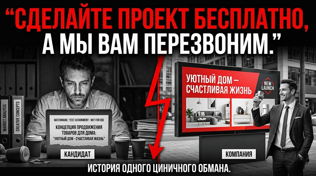 Люди стараются изо всех сил, тратят свои выходные и нервы в надежде получить хорошее место. А хитрая компания просто собирает эти бесплатные кусочки пазла в один готовый проект. После этого всем кандидатам рассылаются стандартные вежливые отказы. Вакансия тихо закрывается, а фирма получает готовую работу абсолютно бесплатно.