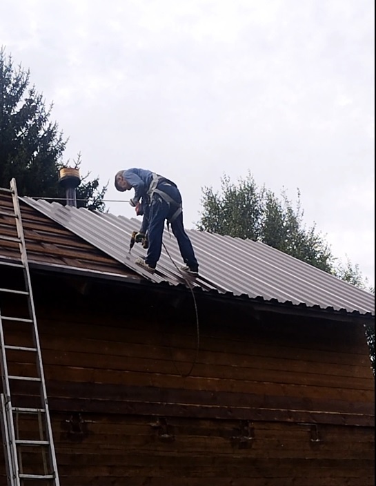 Для обустройства кровли по заказу были нарезаны на заводе металлические профлисты марки НС 35 (с большой волной) длиной 3,65 с большим запасом прочности толщиной 0.7 мм. Для крепления использовали кровельные саморезы с резиновой прессшайбой. Заказывали полный комплект, и кроме профлиста в него входили торцевые и ветровые планки, конек. Перед установкой металлического профиля мы сделали обрешетку из обрезной доски 25*150 мм с каждой стороны ската по 7 горизонтальных полос. По данной обрешётке было удобно передвигать при монтаже листов кровли. Для страховки я использовал альпинистскую веревку, привязанную к стропилам с двух сторон и монтажный пояс, закрепленный карабином к этой веревке. Профлисты поднимали вдвоем с помощью веревок за нижние правый и левый края. Я находился на крыше, а сын закреплял и подталкивал лист, поднимаясь по лестнице. Было не очень удобно поднимать их, но мы справились. Листы накладывали друг на друга внахлест, перекрывая друг друга по волне. На один профлист для