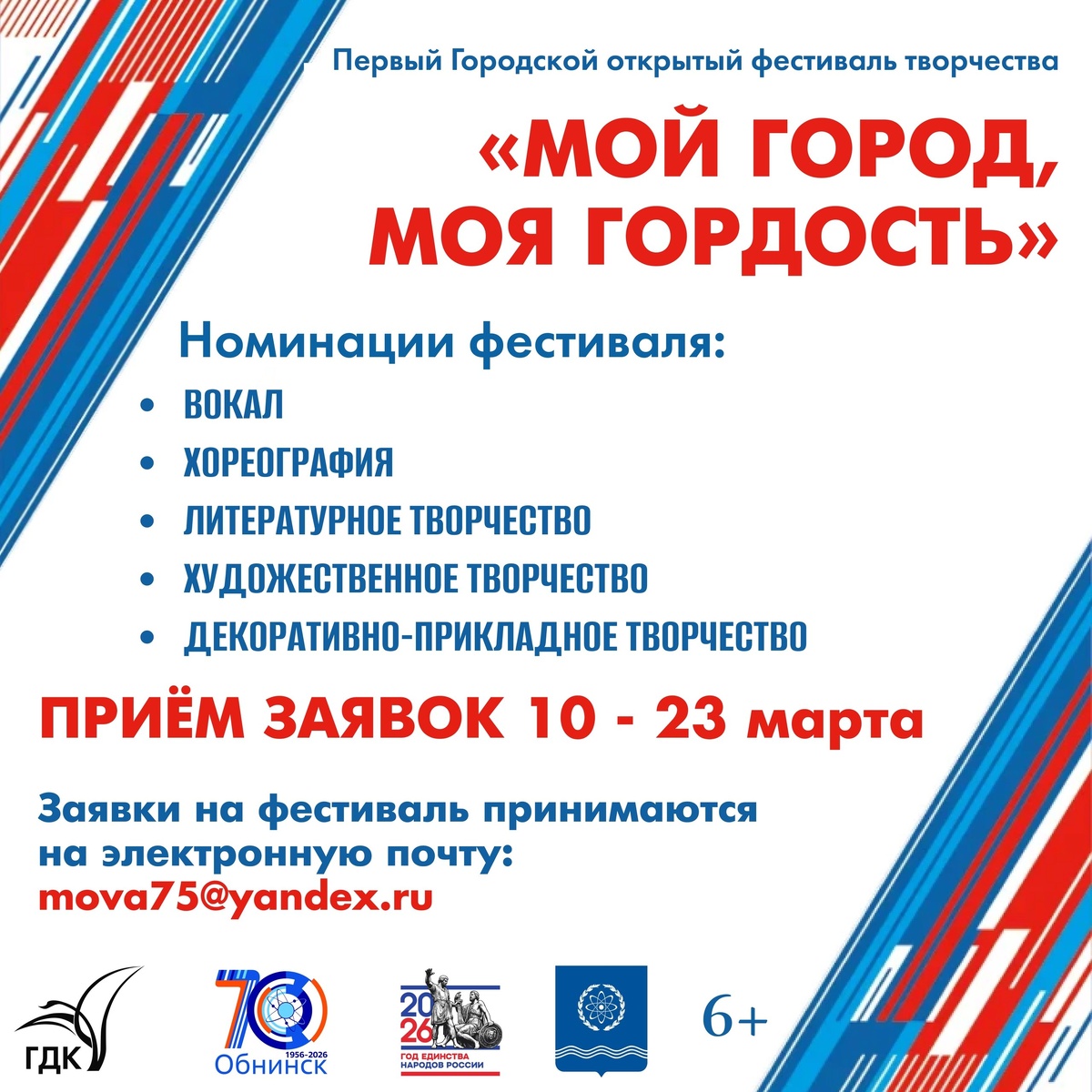 К участию приглашаются жители наукограда и Калужской области без возрастных ограничений. Финальное мероприятие фестиваля состоится 28 марта в 12:00 на сцене Городского Дворца культуры. Победители в каждой номинации получат дипломы и памятные подарки, все участники — дипломы участников. Заявки на фестиваль принимаются на электронную почту: mova75@yandex.ru. Телефон для справок: 8 903 813 8575 (Мова Наталья Геннадьевна). ✅Заявка для участия в номинациях ХУДОЖЕСТВЕННОЕ ТВОРЧЕСТВО и ДЕКОРАТИВНО-ПРИКЛАДНОЕ ТВОРЧЕСТВО ТУТ‼: https://forms.yandex.ru/u/69b0080250569042dcabb13a/ ✅Заявка для участия в номинациях ВОКАЛ, ХОРЕОГРАФИЯ, ЛИТЕРАТУРНОЕ ТВОРЧЕСТВО ТУТ‼: https://forms.yandex.ru/u/69b0097949af4722a4f21cb5/