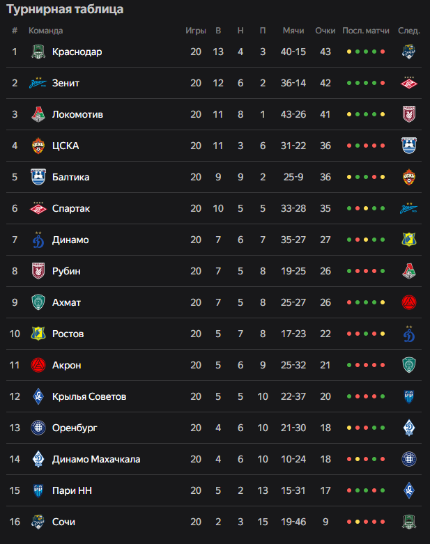 20-й тур чемпионата России преподнёс уникальный сюрприз: все пять команд, входящих в топ-5, не смогли выиграть. Такого не было давно. «Краснодар» на выезде проиграл «Рубину» — 1:2. «Зенит» тоже уступил в гостях «Оренбургу» с тем же счётом, упустив шанс возглавить гонку. «Локомотив» мог догнать лидера, но сыграл вничью с «Ахматом» — 2:2. ЦСКА крупно уступил «Динамо» — 1:4. «Балтика» разошлась миром с «Ростовом» — 1:1. В итоге «Краснодар» сохранил первую строчку с 43 очками. «Зенит» отстаёт на одно очко, «Локомотив» имеет 41 балл. ЦСКА и «Балтика» — по 36, но армейцы впереди по дополнительным показателям. В программе тура ещё оставался матч «Спартак» — «Акрон», но главное уже случилось: гранды дружно потеряли очки, подарив надежду середнякам. Следующий тур пройдёт 13–15 марта.