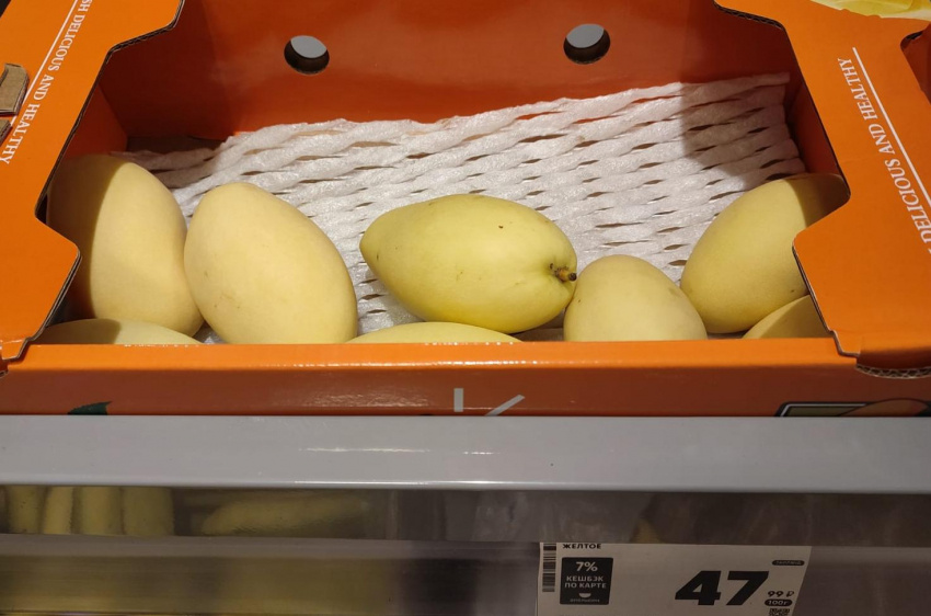 И вот пожалуйста - желтое манго "собственной персоной" в Камышине. Продается в сетевиках по 480 рублей за килограмм как ни в чем не бывало. Суперменеджеры пишут на ценнике сумму в 48 рублей за 100 граммов. Видимо, чтобы покупатель пустил от аромата с витрины слюнки, захотел заокеанского медового десерта во что бы то ни стало и взял хотя бы один экземпляр на пробу, не сразу испугавшись дороговизны.