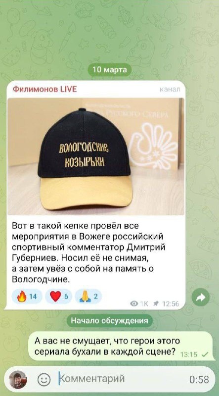 Георгий Филимонов заблокировал в своем Telegram-канале старшего корреспондента отдела «Политика» газеты «Ведомости» Александра Тихонова. Факт блокировки журналист подтвердил редакции телеканала «Русский Север». Поводом, по словам Александра, стал ироничный комментарий под одним из постов главы региона. Губернатор Георгий Филимонов сегодня выложил фото кепки с надписью, референсом которой стал сериал «Острые козырьки». Александр Тихонов оставил «безобидный, полушутливый комментарий»,иронично указывая на атмосферу сериала — герои «Острых козырьков» регулярно появляются на экране со стаканом виски и употребляют алкоголь практически в каждой серии. А ведь это примечательно, потому что в регионе уже год действует закон «12-14». После комментария Александр Тихонов обнаружил, что больше не может писать в Telegram-канале губернатора. Кроме того, конкретно под этим постом Георгий Филимонов запретил какие-либо обсуждения. Скриншоты: Телеграм-канал Александра Тихонова. Telegram | ВКонтакте