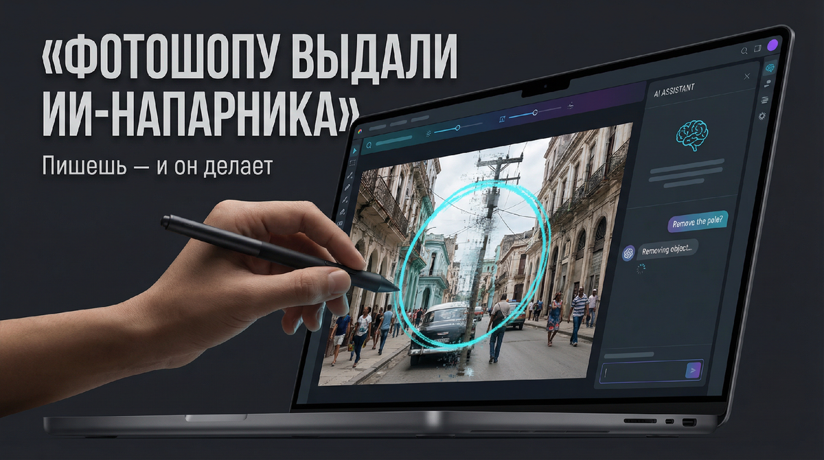 Ты наверняка знаешь это чувство: открываешь Фотошоп, хочешь убрать один столб с фотографии — и уходишь в получасовой квест по меню, туториалам и вопросам «где эта кнопка, которую я видел в 2017-м». Adobe решила эту проблему радикально: теперь Фотошопу можно просто написать, что нужно сделать. Словами. Как сообщение другу. Смысл простой: пишешь запрос — редактор делает. Убрать случайного прохожего с фото, который опять влез в кадр. Сделать картинку теплее или холоднее. Поменять фон. Обрезать под формат сторис — без линейки, слёз и «почему оно съехало на два пикселя». Это ощущается как ретушёр, который не спорит, не уходит на перекур и не просит «а можно исходники в TIFF». Бета-версия уже работает в веб-версии и мобильных приложениях — то есть даже без установки. Отдельная новинка: можно прямо на фото нарисовать маркером, что и где хочешь поменять — и ассистент превратит это в действие. Обвёл столб — убрал. Нарисовал условный цветочек — он попробует сделать нормальный. Отметил область —