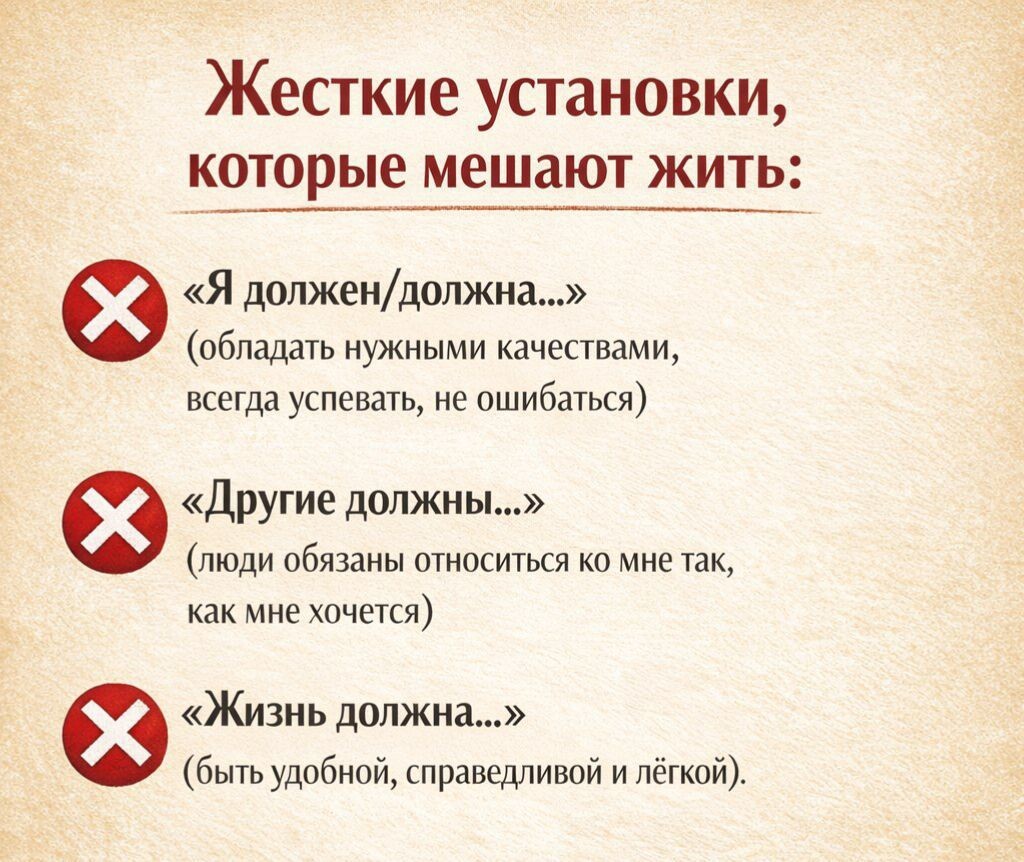 • «Я должен/должна…» (обладать нужными качествами, всегда успевать, не ошибаться)
