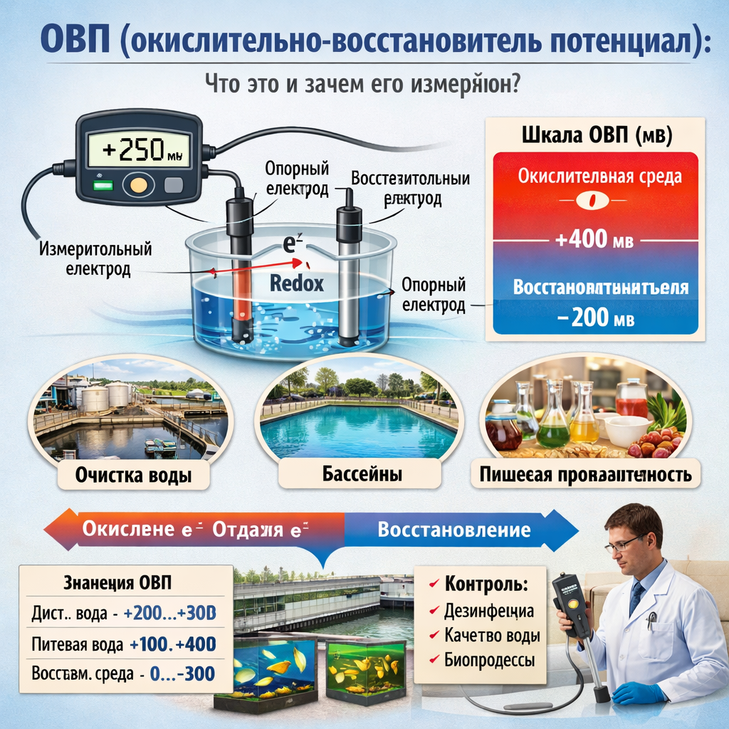 4 ОВП (окислительно-восстановительный потенциал) — это показатель способности среды принимать или отдавать электроны в химических реакциях. По-английски этот параметр называется ORP (Oxidation-Reduction Potential). Он измеряется в милливольтах (мВ) и отражает, насколько среда является: Иными словами, ОВП показывает направление и интенсивность окислительно-восстановительных процессов, происходящих в жидкости или растворе. В основе показателя лежат окислительно-восстановительные реакции (redox-реакции). Пример простой реакции: ОВП измеряет электрический потенциал, возникающий между: Если среда активно принимает электроны — значение ОВП будет положительным.