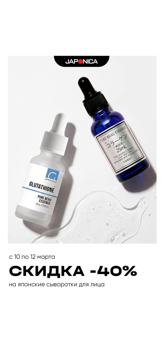 Встречаем солнечные дни новой акцией: с 10 по 12 марта все сыворотки Japan Gals Pure Beau Essence со скидкой 40