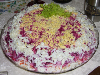 Селёдка была дешёвой и солёной — идеальная основа. Свёкла давала сладость и яркий цвет. Картошка и морковь — сытность и мягкость. Лук добавлял остроту. Майонез связывал всё воедино и делал салат нежным. Всё вместе создавало гармонию вкусов: солёное, сладкое, острое и жирное. К тому же салат выглядел празднично — яркие слои в прозрачной посуде или на тарелке.
