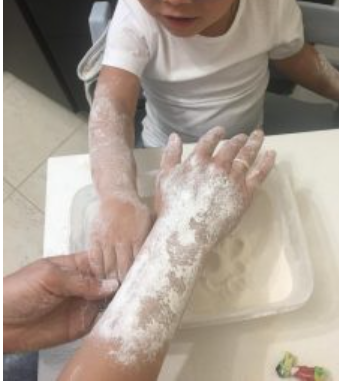 И специальный летний сенсорный опыт - белый цвет хорошо запомнится, если вместе с ребёнком посыпать загорелые руки белой мукой. И просто поиграть в муку - рисовать на ней, пересыпать, закапывать в неё фигурки...
