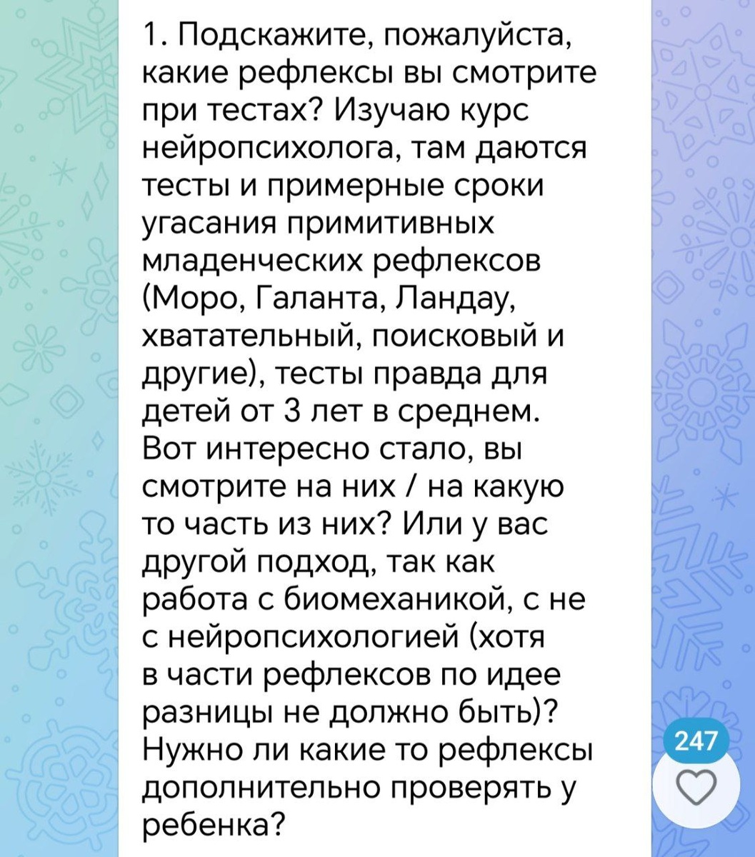 Вопрос из клуба про рефлексы: какие рефлексы я проверяю и как с ними работаю 👇👇👇 ⭐ На указанные в вопросе рефлексы смотрю в анализе движений. Эти рефлексы перечислены и показаны в уроке Новорожденность - каждая мама сама может проверять ребёнка 👌 ⭐Некоторые из перечисленных рефлексов использую в работе 💚Например, Галант прекрасно стимулирует сгибание бока и разгибание спинки по стороне стимуляции - когда проводим вдоль позвоночника 💚Или поисковый для поворота головы у 0+ 💚Хватательный для усиления силы захвата, если обнаружена слабость 💚Опорный - когда ползаем с опорой под одну стопу или когда стимулируем разгибание ножки, лёжа на спине ⭐В своей диагностике рефлексов я использую: 1. Тест на наклоны Проверка статуса тонического лабиринтного рефлекса по 4м сторонам: левая, правая, передняя, задняя ТЛР тонизирует конечности (превращает их в палочки) не только во время теста, но и в естественном движении - что затрудняет само движение и освоение навыка 2. Оптическая реакция н