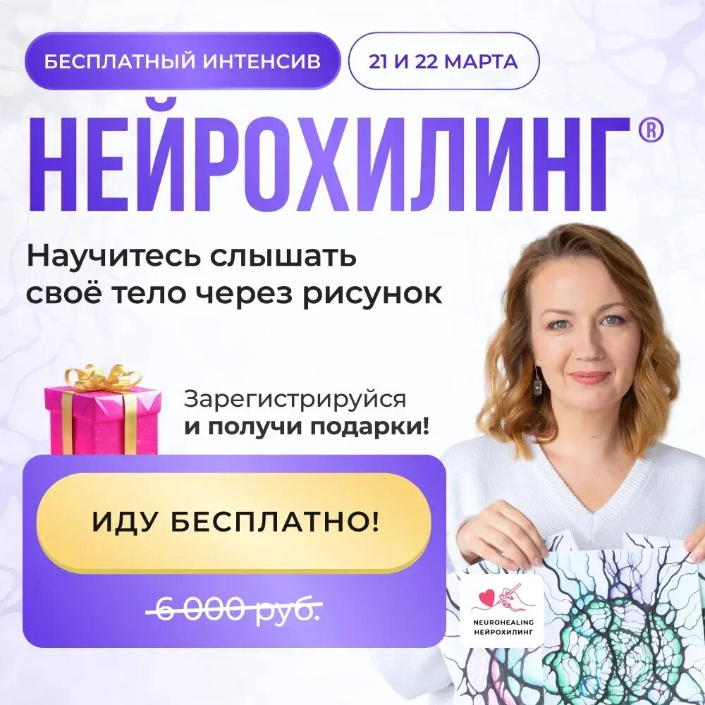 Друзья, приглашаю вас на долгожданное обновление бесплатного интенсива НейроХилинг®. Будем рисовать 21 и 22 марта! Запись будет для тех, кто зарегистрируется. Иду БЕСПЛАТНО! 👈 — Как можно полноценно радоваться жизни, если что-то болит?