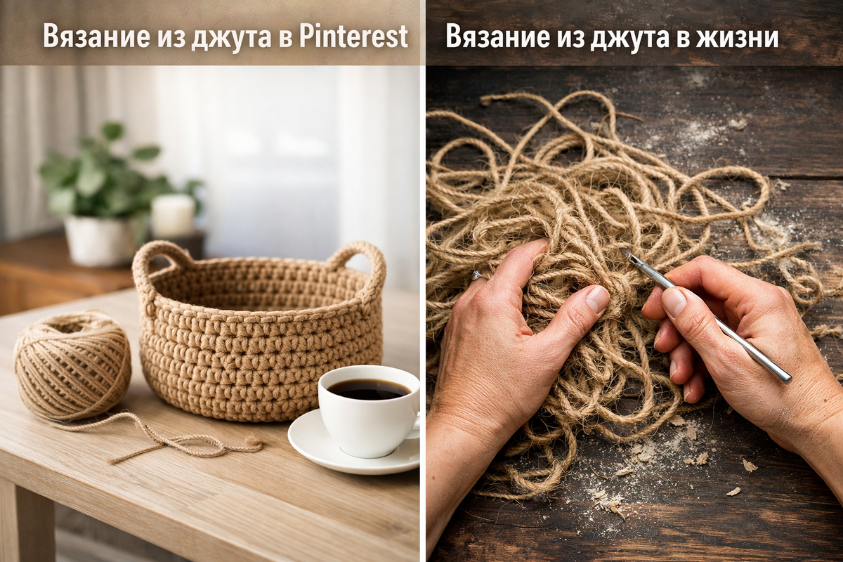 Фотографии красивые: светлый интерьер, деревянный стол, аккуратная корзинка, внутри плед или цветы. Всё выглядит так уютно и эстетично, что кажется — вот оно, идеальное рукоделие.