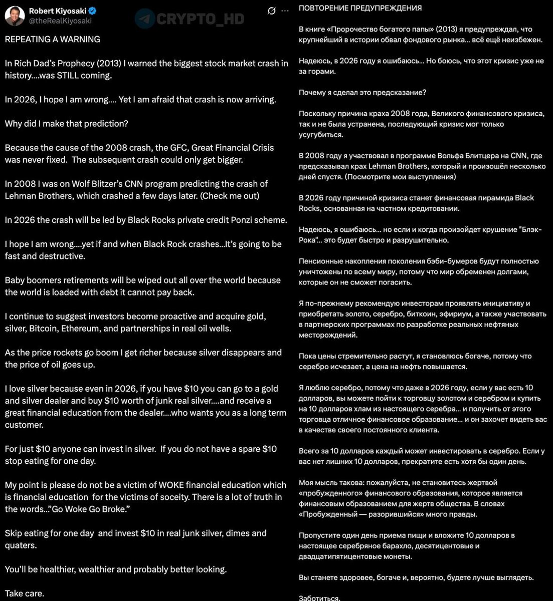 ». ➥ Триггером 2026 года станет частный кредитный рынок BlackRock на $2T – непрозрачный и слабо регулируемый. ➥ Пенсионные накопления миллионов людей по всему миру под угрозой – глобальный долг достиг рекордных $315T. ➥ Причина мирового финансового кризиса 2008 года так и не была устранена – долг просто продолжает расти. Автор книги «Богатый папа, бедный папа» советует держать Золото, Серебро, BTC и нефтяные активы. Напомним, он регулярно предсказывает крах рынка «в ближайшей перспективе». Crypto Headlines