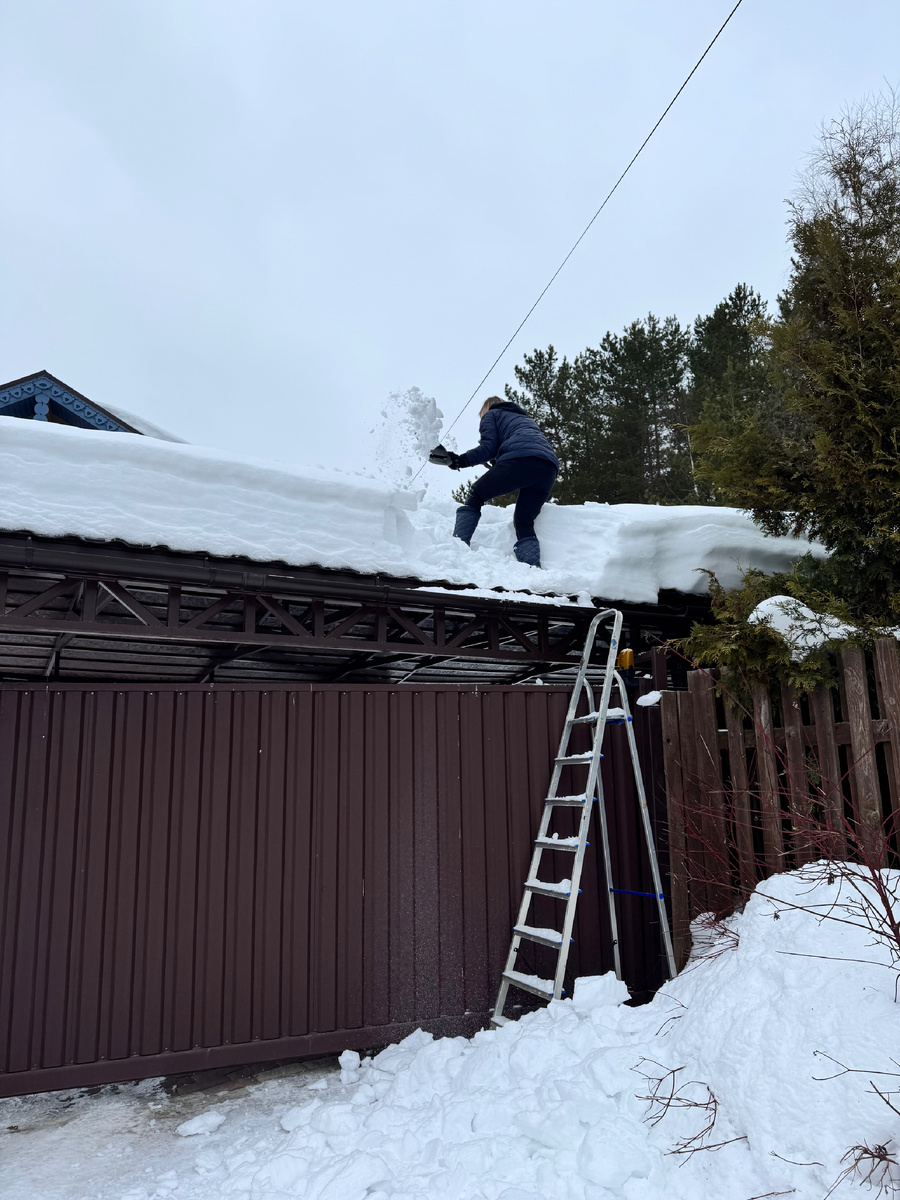Муж с дочерью решили расчистить крышу навеса и гаража от метрового тяжеленного снега. Всю зиму не решались туда залезать, но дочь у меня шустрая, два дня - и крыше полегчало