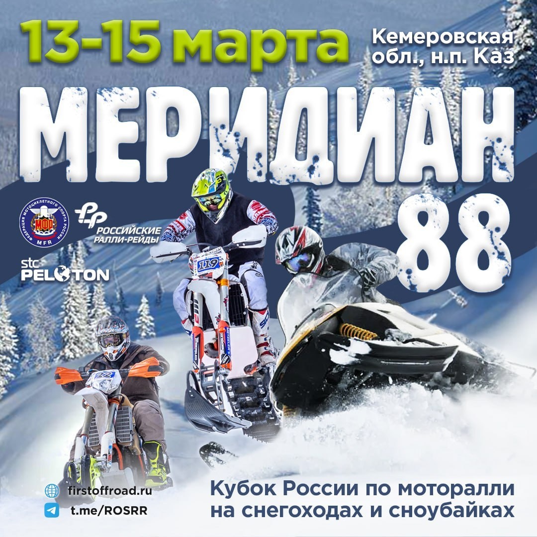 КР по моторалли на снегоходах и сноубайках Меридиан-88 2026 (Каз) Мотофесты RSS Классы Снегоходы: Класс 2Т / Класс 4Т Сноубайки: Основной / Ветераны Пятница, 13.03.2026 С 14:00 открытие Сервисного парка. Заезд участников соревнования. В 20:30 обязательный брифинг для всех участников. Суббота, 14 марта 2026 9:30 - старт 1-го этапа (СУ1) (для первого участника). 14:30 - финиш 1-го этапа (ориентировочно для первого участника). 17:10 - финиш 1-го этапа (ориентировочно для n-го участника). 19:00 - публикация стартовой ведомости 2-го этапа. Воскресенье, 15 марта 2026 9:30 - старт 2-го этапа (для первого участника). 13:20 - финиш 2-го этапа (ориентировочно для первого участника). 17:00 - финиш 2-го этапа (ориентировочно для n-го участника). 18:30 - предварительная публикация итоговой классификации. 19:00 - публикация итоговой классификации. 19:30 - торжественное вручение призов, гала-ужин. Взнос Экипаж – 20 000 р. Аренда оборудования – 5 000 - 10 000 р. Канал в... Перей