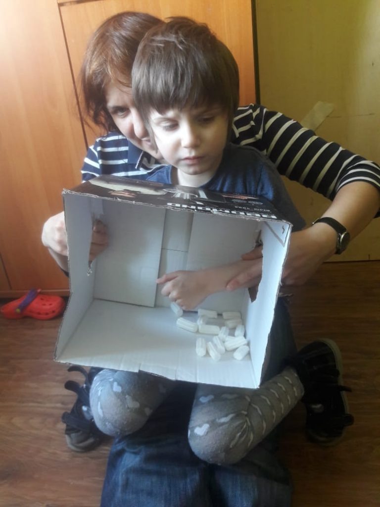Встретила в интернете чудо-коробку с дырками. По замыслу автора, это игра типа "волшебного мешочка", где ребенок должен на ощупь находить нужный предмет, или угадывать, что нашёл. Но для Дениски, который всё ещё соображает лучше, чем пользуется руками, а ради конфет готов на подвиги, получился идеальный тренажёр для рук, где есть всё: сложная задача (конфеты надо находить на ощупь), очень желанный результат и возможность тренировать обе руки по-очереди. Поэтому мы взяли средних размеров коробку, отрезали крышку и проделали дырки для рук. Предлагалось надеть на коробку старую футболку, заправив рукава в дырки, чтобы ребенок не царапался об острые края коробки, но Дэн так путался в рукавах, что проще было обклеить дырки скотчем. Главная подготовка: в коробку мы положили зефир ;-) Правой рукой Дэн быстро наловчился их вытаскивать, левую пока тренируем. Как хорошо, что этот человек так любит зефирки!