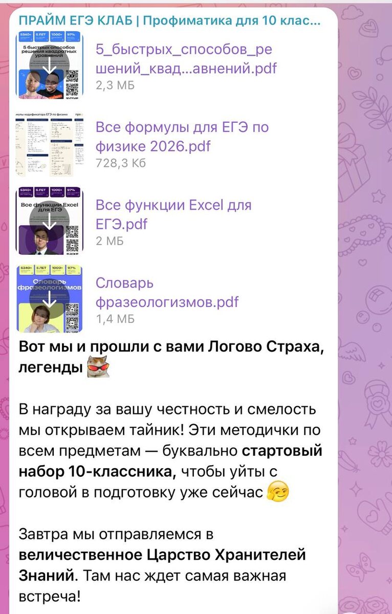 ?🚙 Пока все вокруг вам трубят, что ЕГЭ — это ад, Профиматика открывает дверь в другую реальность! В секретном канале для 10-классников стартует Интенсив, где за одну неделю ты пройдешь путь, который другие идут месяцами: — Разберешь базу по 4 предметам — Заберешь готовый путь подготовки на 1,5 года — Получишь поддержку и помощь от наставников (и много-много полезных методичек) 🤩А ЕЩЕ!!!! Получишь шанс обучаться 1,5 года БЕСПЛАТНО! 🥲 👉Все подробности будут тут