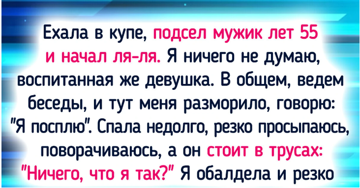 - Ехала в купе, подсел мужик лет 55 и начал ля-ля. Я ничего не думаю, воспитанная же девушка. В общем, ведем беседы, и тут меня разморило, говорю: «Я посплю». Спала недолго, резко просыпаюсь, поворачиваюсь, а он стоит в трусах: «Ничего, что я так?» Я обалдела и резко выдала: «Конечно, нельзя!» В купе больше не езжу.
